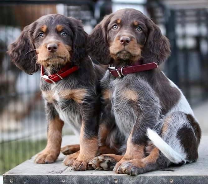 The historical interbreeding with British dogs resulted in 2 recessive coat colors; the yellow, and white/piebald. The “yellow dog” is likely the result of orange belt English Setter blood. Historically “yellow dogs” have been culled immediately after whelping as the yellow coloration does not meet the breed standard. Today genetic testing of Picardy Spaniels for the eLocus gene, that responsible for “yellow dogs,” allows breeders to avoid producing “yellow dogs” by not breeding dogs that are both carriers. “Piebald/white” dogs do conform to the Picardy Spaniel breed standard, and that coloration is more consistent with the historical coat color of the breed. The genetics that produce “piebald dogs” have also been identified and breeding dogs can now also be tested for the rLocus gene.